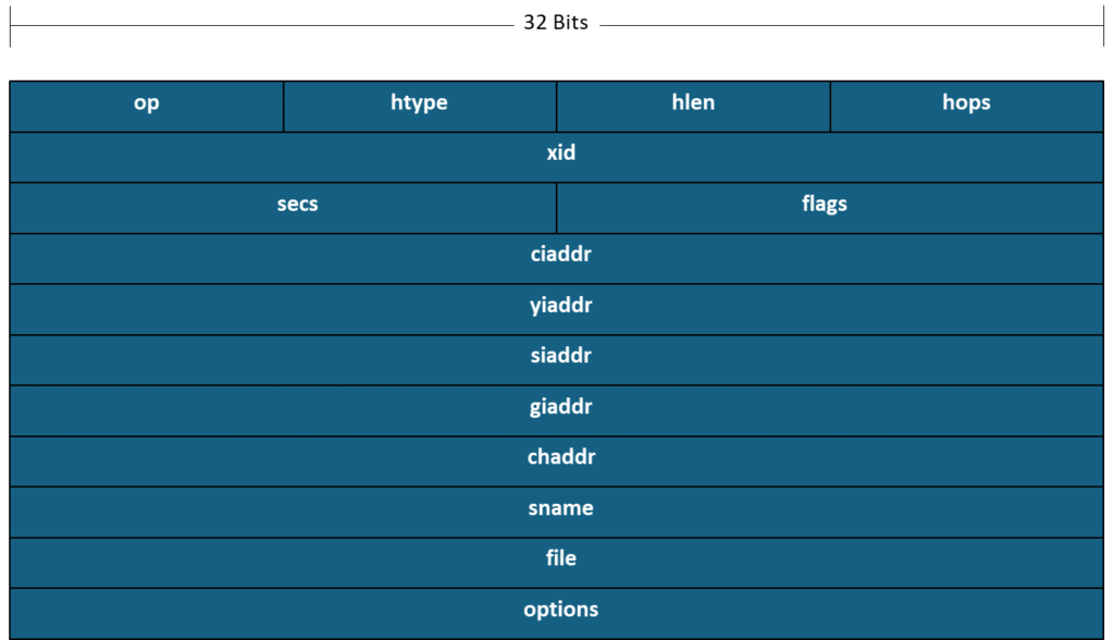 | op | 1 | Message type set by client or DHCP Server) 1 – Boot Request (By client) 2 – Boot Reply (By Server) |
